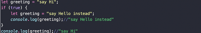 4-let ve const block scope özellikte oldukları için, greeting, yer aldığı scope’a göre farklı değer gösterir.