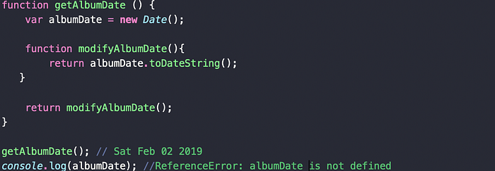 Yukarıda ki işlemde oluşturduğumuz albumDate değişkenine fonksiyonun dışarısında erişmeye çalıştık. albumDate değişkenimiz, getAlbumDate adlı fonksiyonumuz içerisinde tanımlandığı için, sadece o fonksiyon ve o fonksiyonun içerisinde yer alan diğer fonksiyonlar içerisinden erişilebilir durumdadır. Fonksiyon dışında çağırmaya çalışırsak hata alırız.